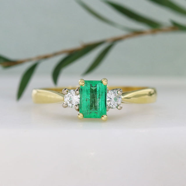 18ct Yellow Gold Emerald Cut Emerald & Diamond 3 Stone Ring