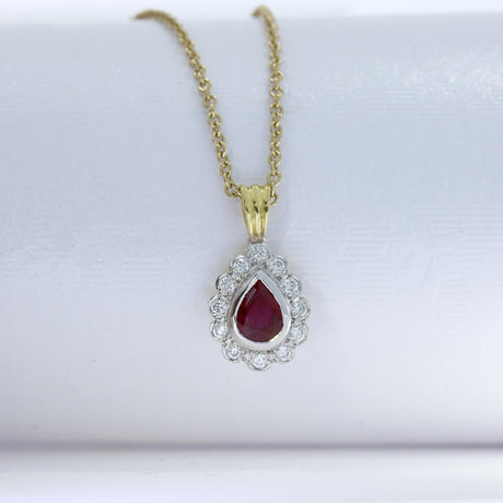 £1,795.00Unit price /Unavailable18ct Gold Fancy Ruby & Diamond Pendant with Diamond Halo
