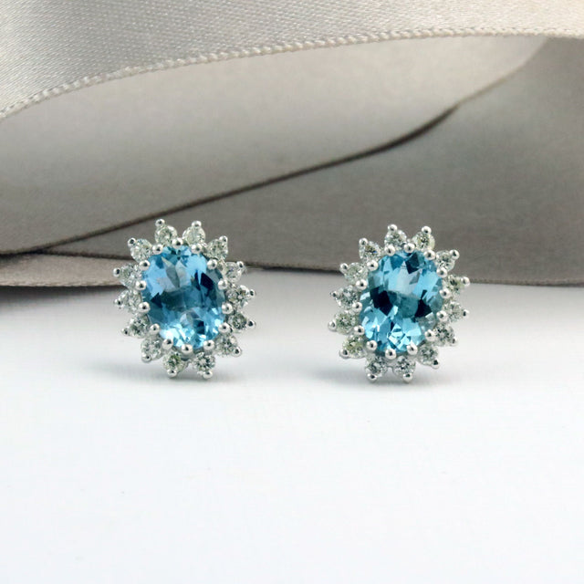 9ct white gold brilliant cut Diamond and oval Aquamarine cluster earrings