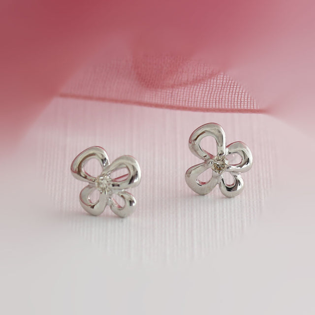 9ct White Gold Flower Shape Stud Earring with Small Claw Set Diamond 0.07ct