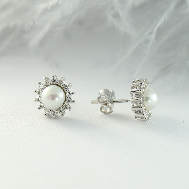 9ct White Gold Pearl Earrings With A Halo Of Claw Set Diamonds with Post & Butterfly Fittings