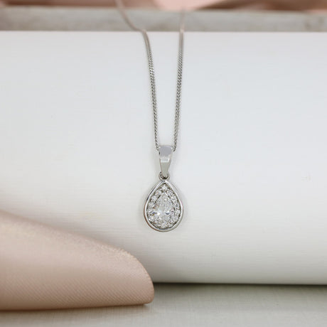 18ct White Gold Pear Shaped Diamond Halo Pendant on an 18ct 18inch White Gold Chain