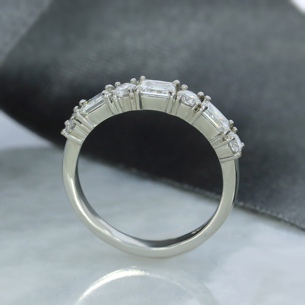 A stunning eternity ring crafted in platinum, featuring alternating emerald cut and brilliant cut diamonds set in a claw setting. This piece celebrates timeless elegance with its continuous sparkle, perfect for marking life's most precious moments.