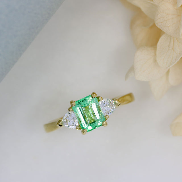 18ct Gold Emerald & Triangular Laboratory Grown Diamond 3 Stone Ring