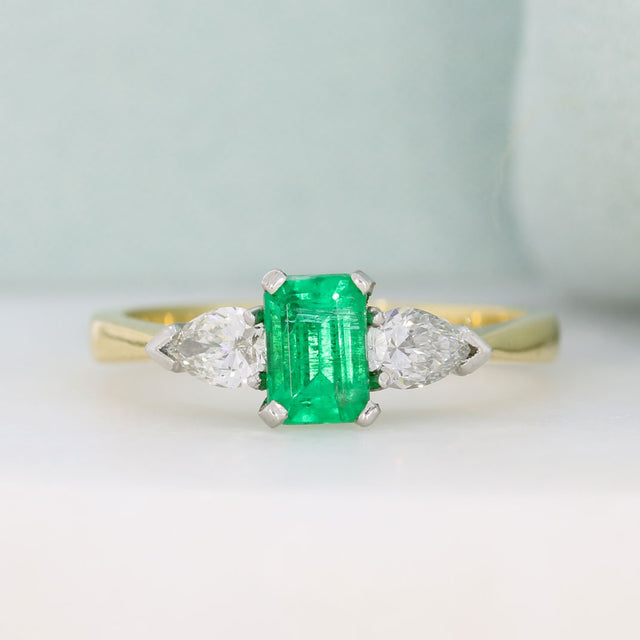 18ct Yellow Gold & Platinum Octagonal Claw Set Emerald & Pear Shape Diamond 3 Stone Ring
