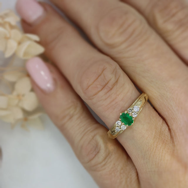 9ct Yellow gold oval emerald and 6 brilliant cut diamonds claw set ring