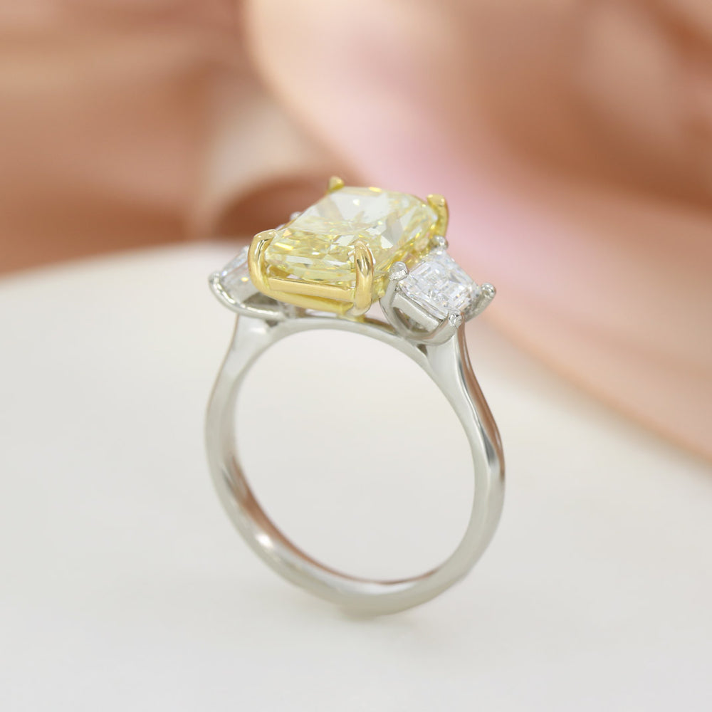 Platinum Certified Claw Set Fancy Intense Yellow Rectangular Brilliant Cut Laboratory Grown Diamond Solitaire Ring with Trapezoid Diamond Shoulders