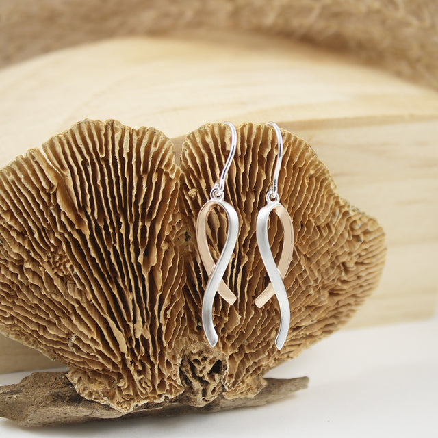 Silver ribbon style earrings with rose gold accent and hook fitting. Also available with yellow gold accent.