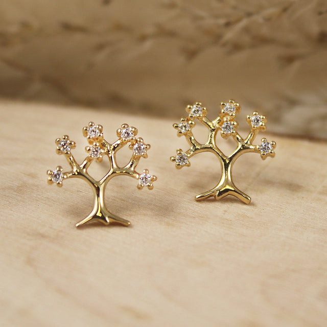 Silver & Yellow Gold Plate Fancy Tree Earrings with Cubic Zirconia with Post & Butterfly Fittings. Also available in Silver & Rose Gold Plate.