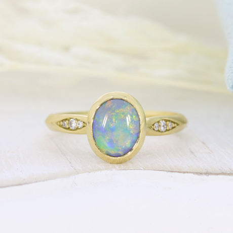 £595.00Unit price /Unavailable18ct Yellow Gold Oval Rubover Set Opal Dress Ring with Pave Set Diamond Shoulders