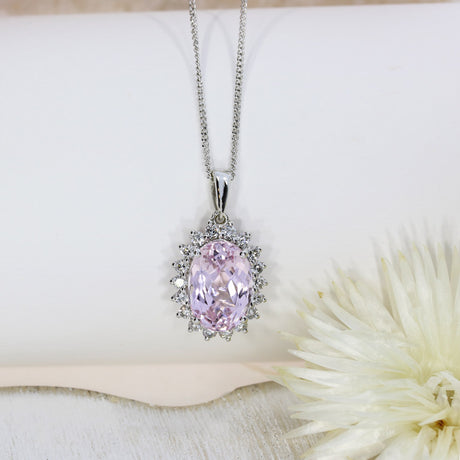 £895.00Unit price /Unavailable18ct White Gold Oval Kunzite & Diamond Cluster Pendant On a 18" Fine Curb Chain