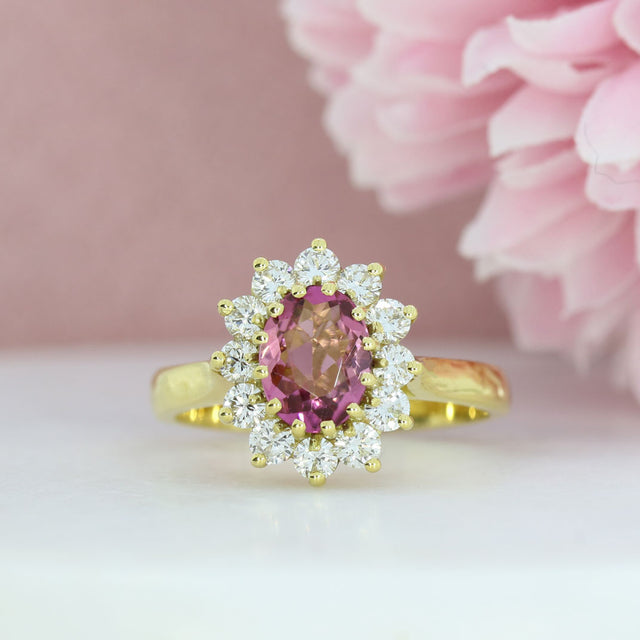 18ct Yellow Gold Oval Pink Tourmaline & Diamond Cluster Ring