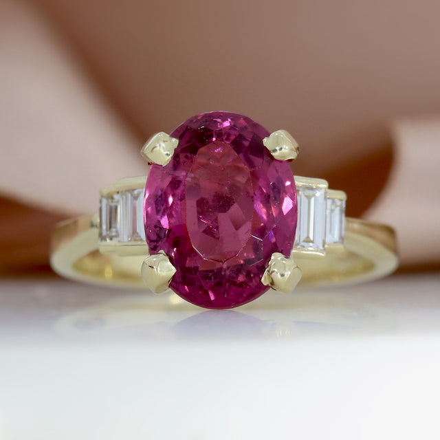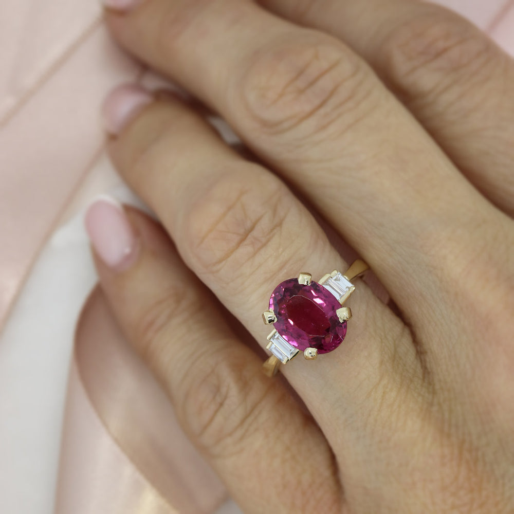 9ct Yellow Gold Claw Set Oval Pink Tourmaline & Laboratory Grown Baguette Diamond Ring.