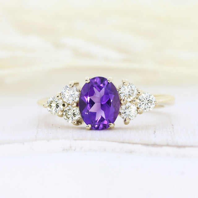 9ct Yellow Gold Ring with an Oval Claw Set Amethyst and 3 Round Diamonds either side