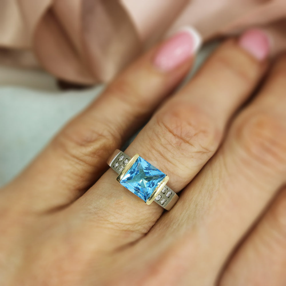This pre-owned 9ct white gold ring with a square blue topaz stone trap set in yellow gold , elegantly accented with diamond-set shoulders and a softly brushed finish.