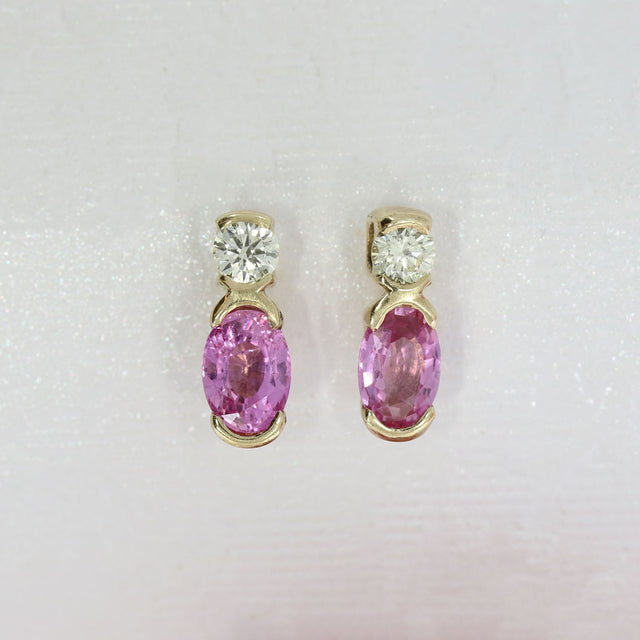 9ct yellow gold earrings with a trap set oval pink sapphire and round diamond
