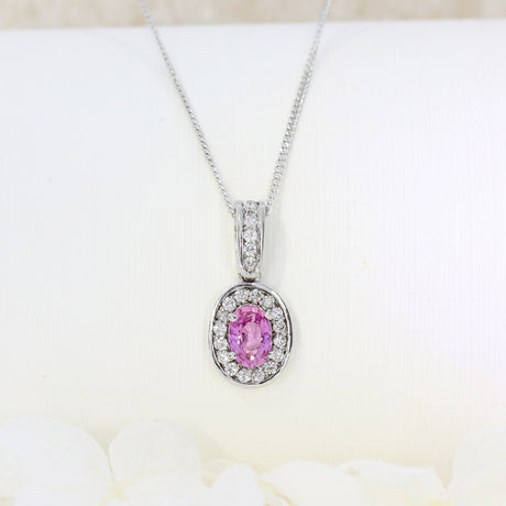 - 18ct White Gold Pink Sapphire and Diamond Halo Pendant on 18ct White 18" Chain £1,170.00Unit price /Unavailable
