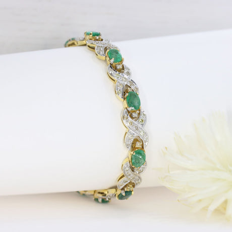 Pre-Owned 14ct Yellow Oval Emerald & Pave Set Diamond Bracelet