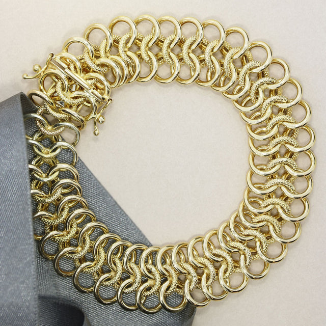 Pre Owned Wide 9ct Yellow Gold 3 Row Interlocking Circle Link Bracelet
