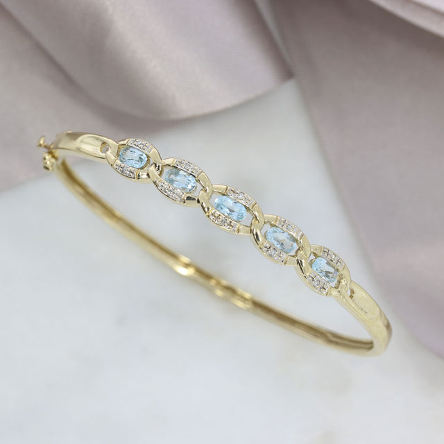 Pre Owned 9ct Yellow Gold Hinged Bangle with Blue Topaz & Diamonds