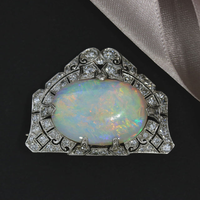 Pre Owned 18ct White Gold Cabochon Cut Opal Brooch with Early Round Cut & 8 Cut Diamonds.
