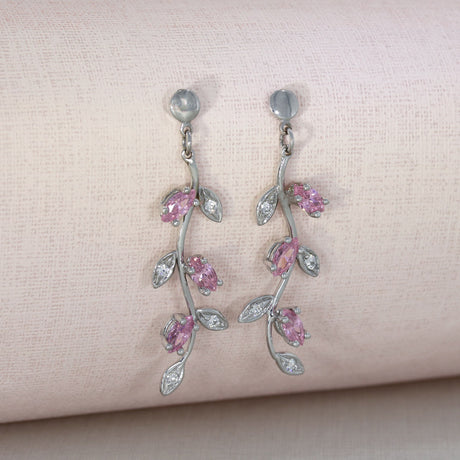 Pre Owned 9ct White Gold long Drop Earrings with Pink CZ.