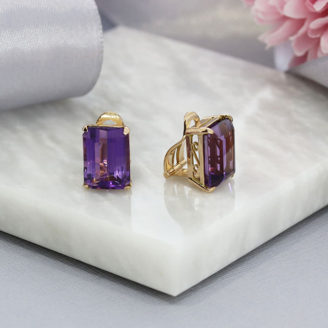 Pre Owned 14ct Gold Large Claw Set Oblong Amethyst Clip On Earrings