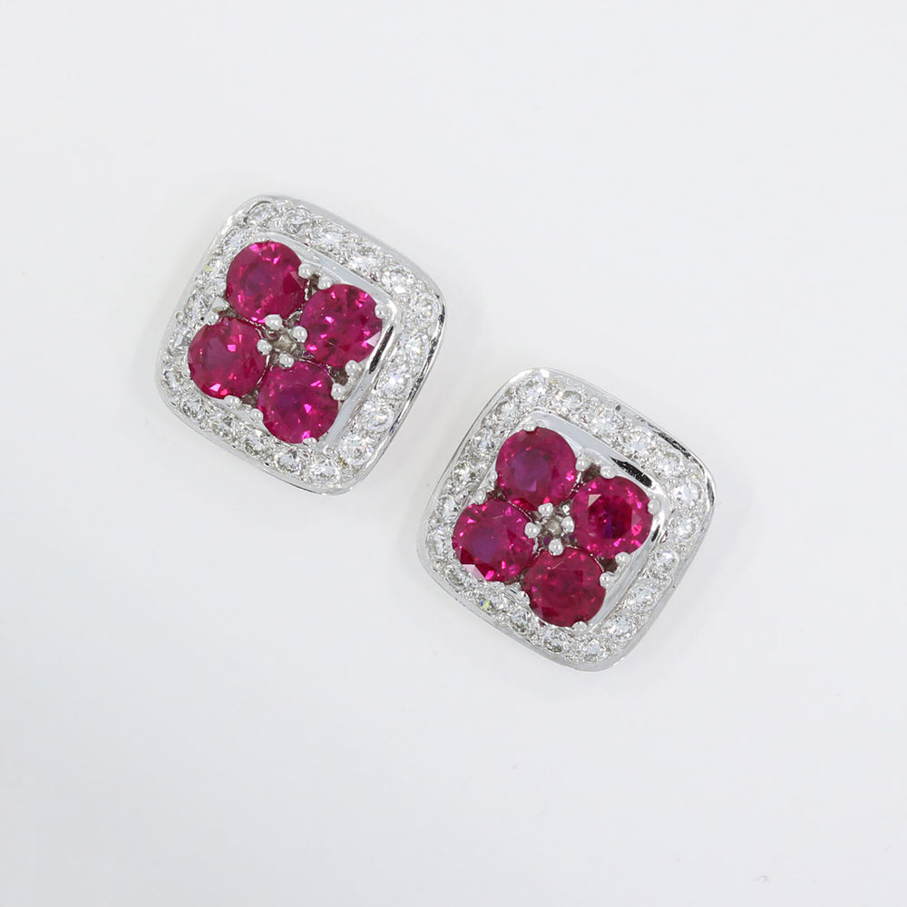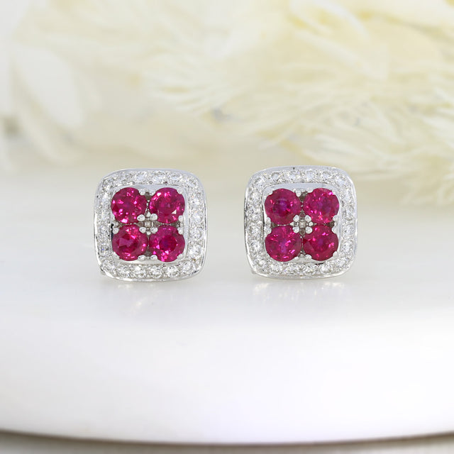 Pre Owned 18ct White Gold Round Ruby & Diamond Earrings in a Square Cluster Setting