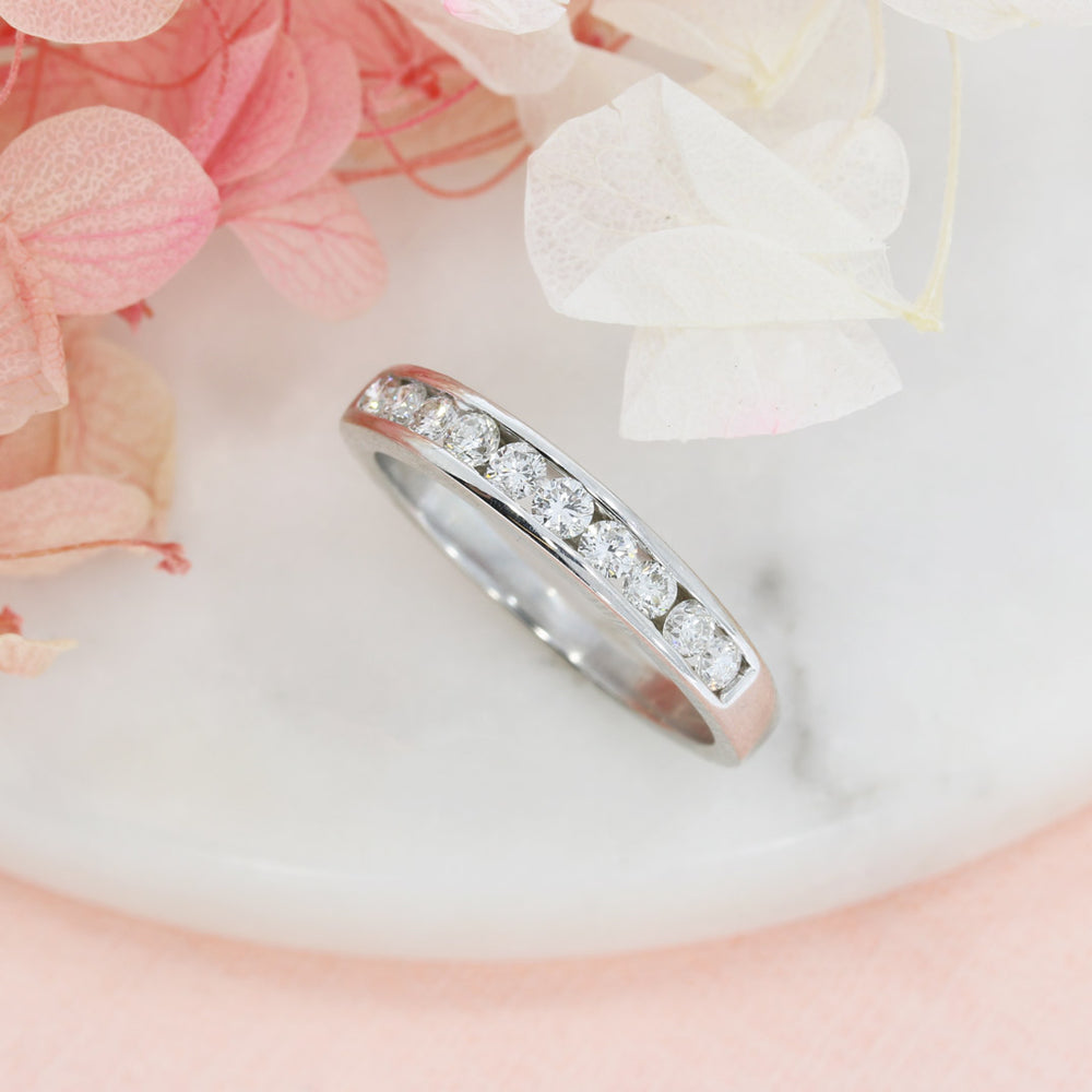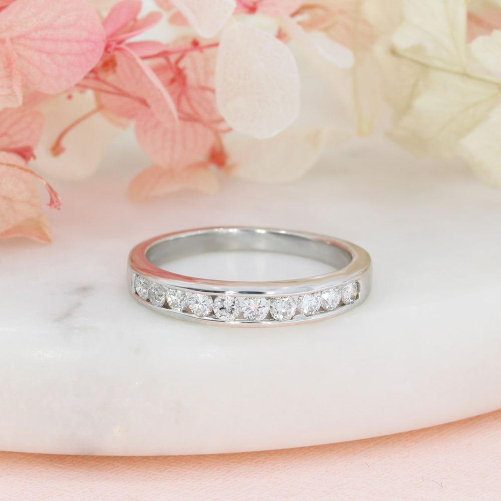 Elegant pre owned 18ct white gold diamond eternity ring in a channel setting totalling 0.50ct. Perfect as a wedding band, anniversary gift, or everyday luxury piece.