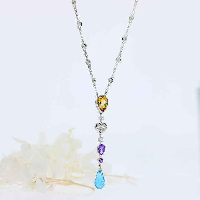 Pre Owned 18ct White Gold Multi Gemstone Necklace featuring a unique drop with centres on a Pear Shaped rub over set Citrine dropping down to brilliant cut Diamond to a heart shaped channel setting incorporating princess and half moon cut diamonds. Followed by an inverted Amethyst and round Amethyst in claw settings fastening to a faceted Blue Topaz briolette all attached to a rounded belcher link chain, punctuated by 12 brilliant cut diamonds in collar settings.