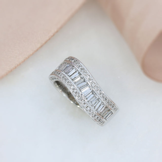 Pre Owned 18ct White Gold Triple Row Wave Ring, Channel Set with Baguette Diamonds through the Centre and Brilliant Cut Diamonds on the Outer Edges and Border of the Ring.