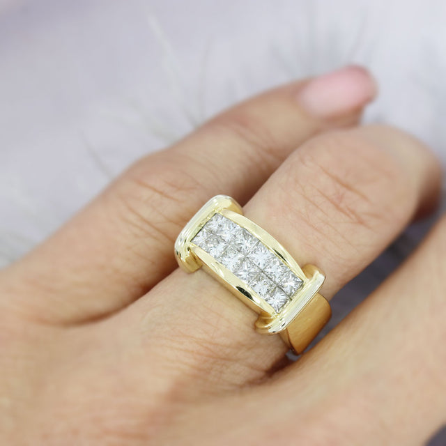 Pre Owned 18ct Yellow Gold Diamond Dress Ring with Two Rows of Princess Cut Diamonds and Raised Side Bars