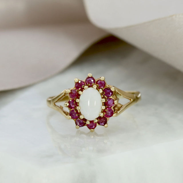 Pre Owned 9ct Yellow Gold Ruby & Opal Oval Cluster Ring