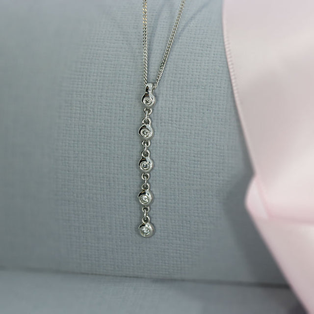 Pre Owned 18ct White Gold Fine Drop Pendant with Rub Over Set Diamonds on a 18 inch Chain