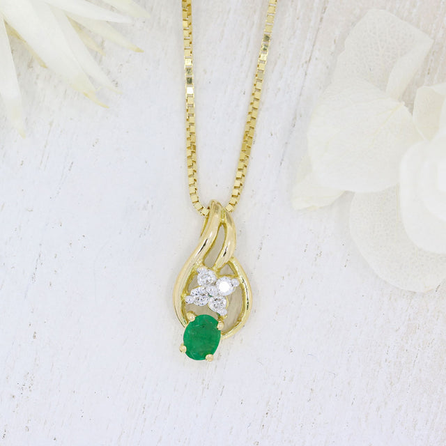 Pre Owned 18ct Yellow Gold Emerald & Diamond Pendant complete with 18 inch Box Chain