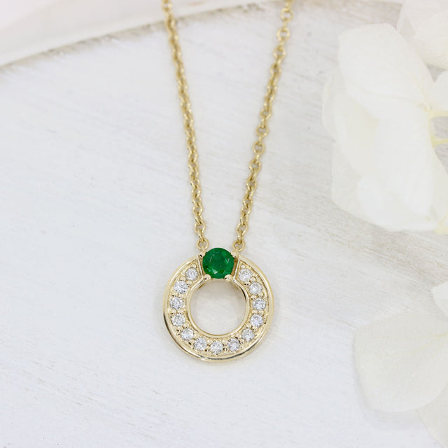 Pre-Owned 9ct Yellow Gold Pave Set Diamond & Emerald Circle Pendant & 20"Chain