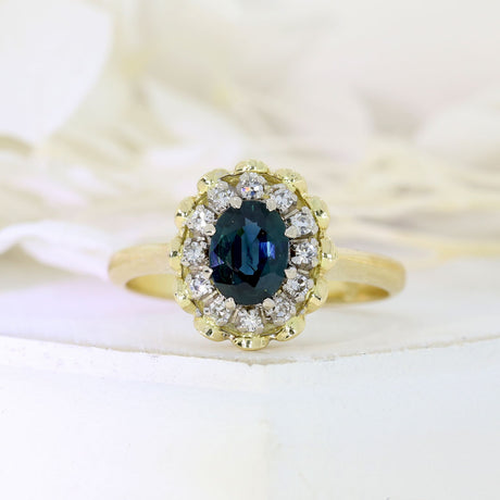 £4,150.00Unit price /UnavailablePre Owned 9ct Yellow Gold Oval Sapphire & Diamond Cluster Ring