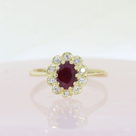 £1,695.00Unit price /UnavailablePre Owned 18ct Yellow Gold Oval Ruby & Diamond Cluster Ring