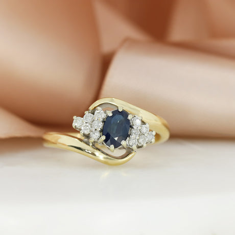 £350.00Unit price /UnavailablePre Owned 9ct Yellow Gold Oval Sapphire & Diamond Cluster Ring in a Crossover Setting