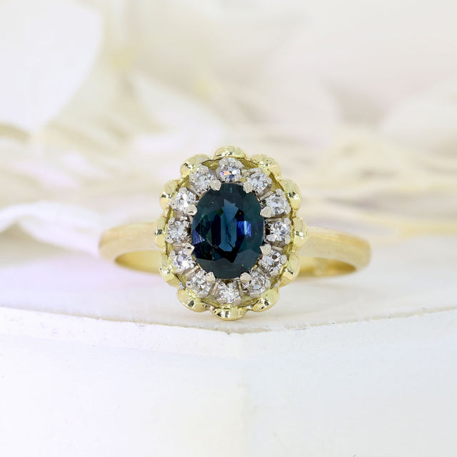 pre-owned ring crafted in 18ct yellow gold, featuring an oval sapphire secured by claw settings and encircled by a cluster of diamonds within a gold surround.