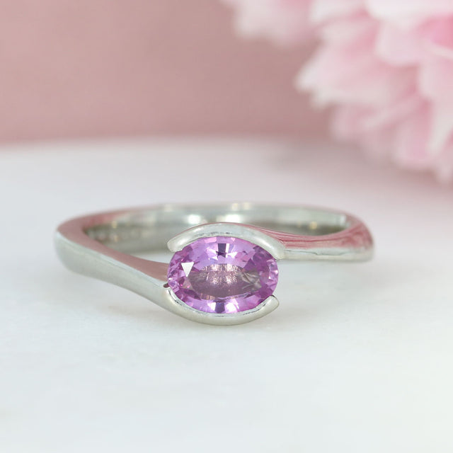 Pre Owned 18ct white gold oval pink sapphire side trap set in a cross over style
