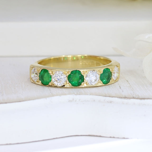Pre Owned 18ct yellow gold emerald and diamond half eternity ring
