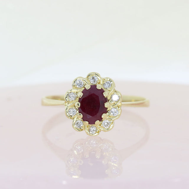 This exquisite pre owned ring showcases an oval ruby surrounded by a cluster of diamonds, all set in 18ct yellow gold.