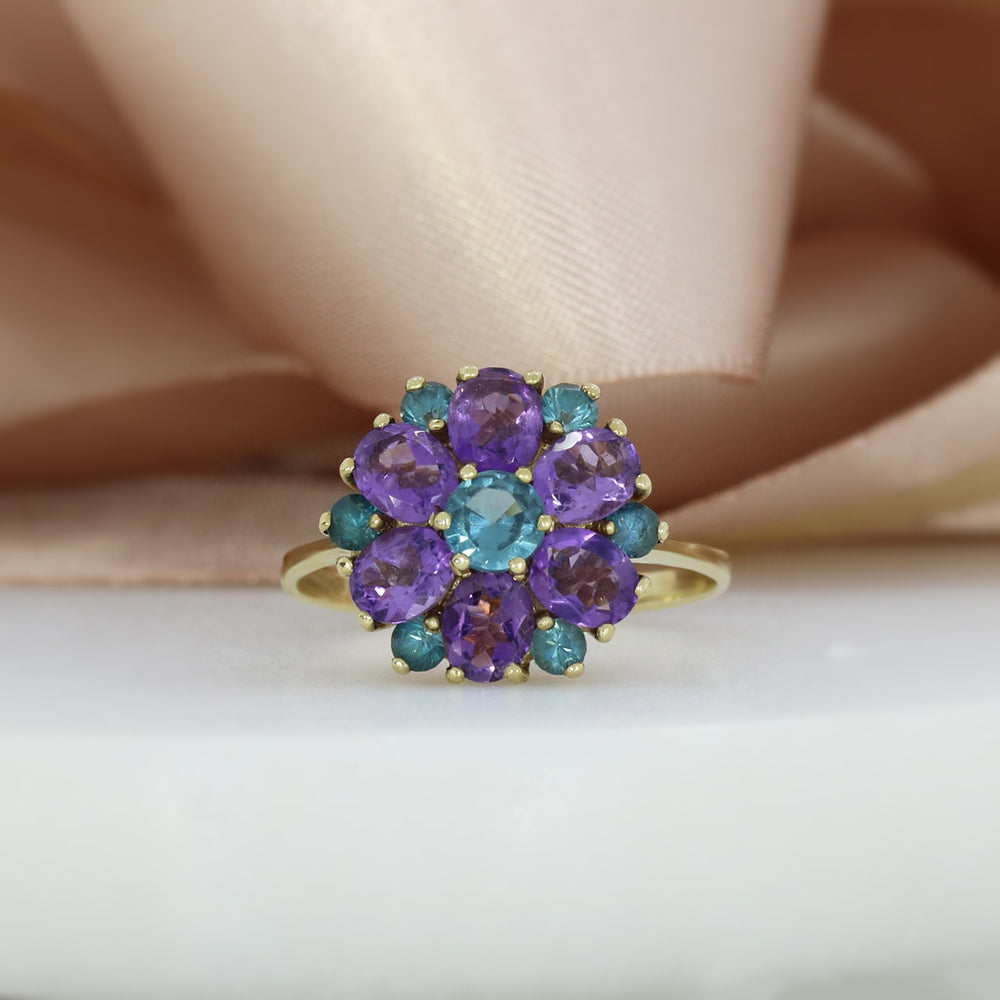 Pre Owned 9ct Yellow Gold Blue Topaz & Amethyst Flower Cluster Ring