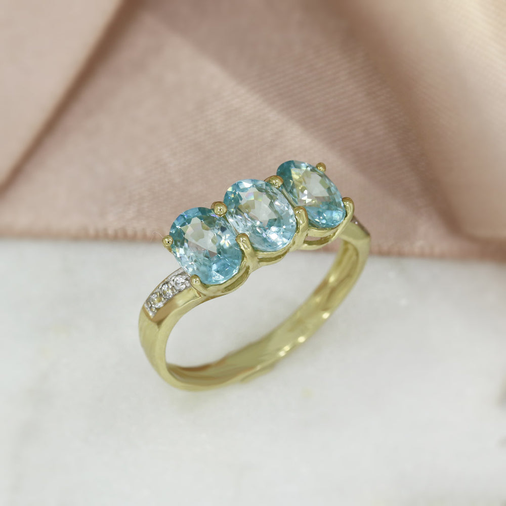 Pre Owned 9ct Yellow Gold Claw Set Oval Aquamarine 3 Stone Ring with Diamond Set Shoulders