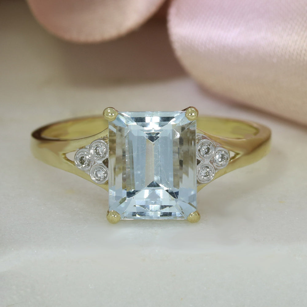 Pre Owned 9ct Yellow Gold Oblong Aquamarine Ring with Diamond Set Shoulders
