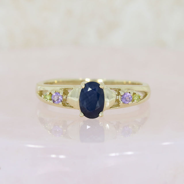 Pre Owned 9ct Yellow Gold Oval Sapphire Ring with Amethyst & Peridot Shoulders