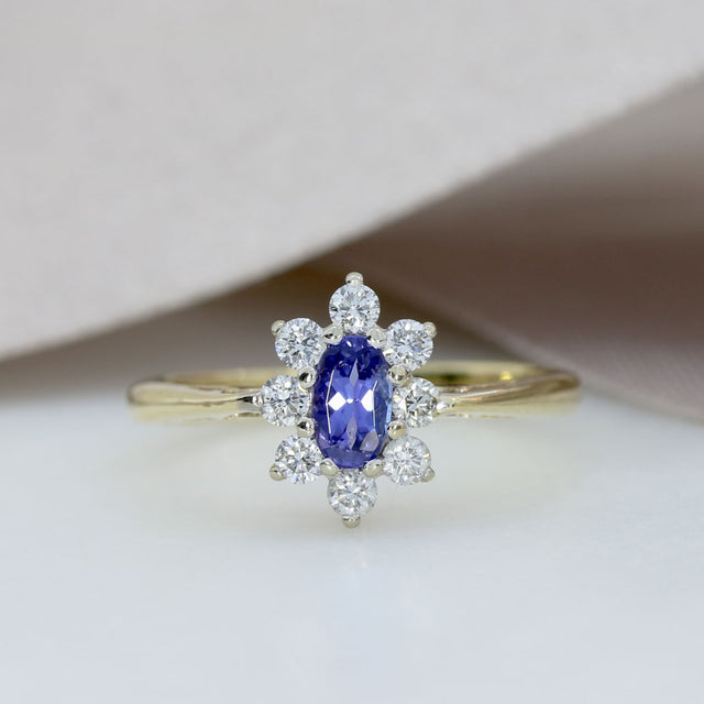 Pre Owned 9ct Yellow Gold Oval Tanzanite & Diamond Cluster Ring