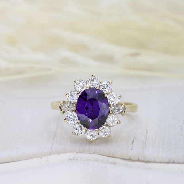 Pre Owned 9ct Yellow Gold Synthetic Purple Stone & CZ Cluster Ring