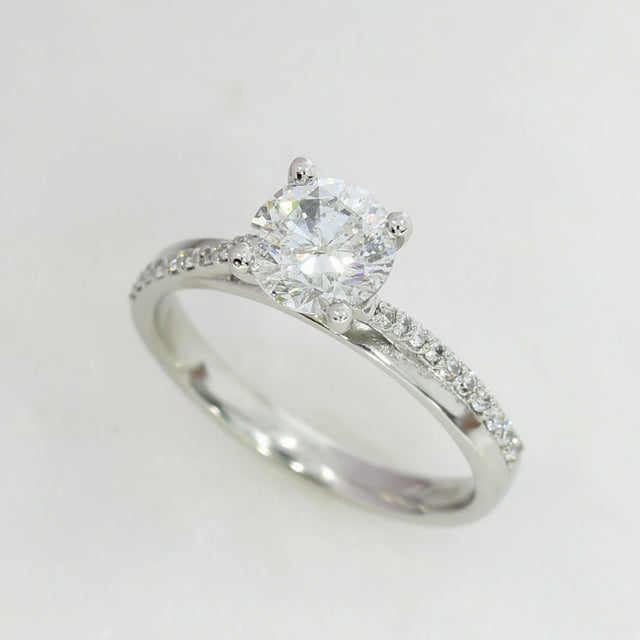 This elegant pre owned platinum solitaire ring features a 1.18ct brilliant cut diamond secured by a classic four claw setting. The gracefully designed shoulders are adorned with a crossover of smaller diamonds, totalling 0.12ct, adding refined sparkle to this timeless piece.